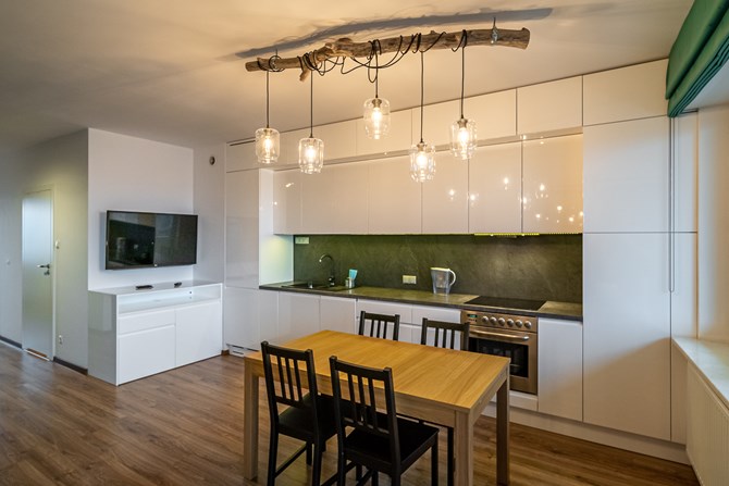 *Aneks kuchenny: lodówko-zamrażarka, zmywarka, płyta indukcyjna 4-polowa, piekarnik, meble kuchenne, zlew z ociekaczem.