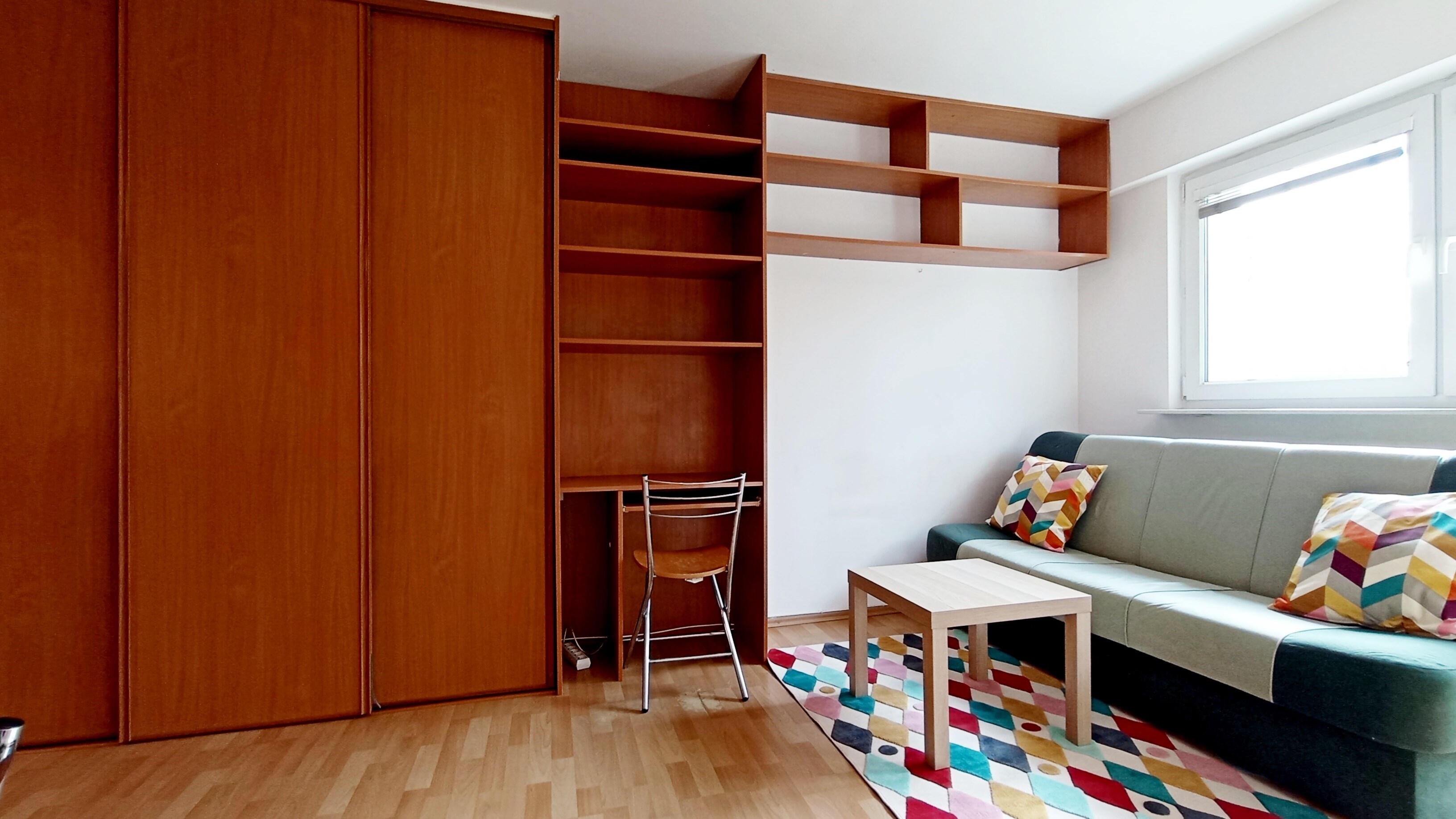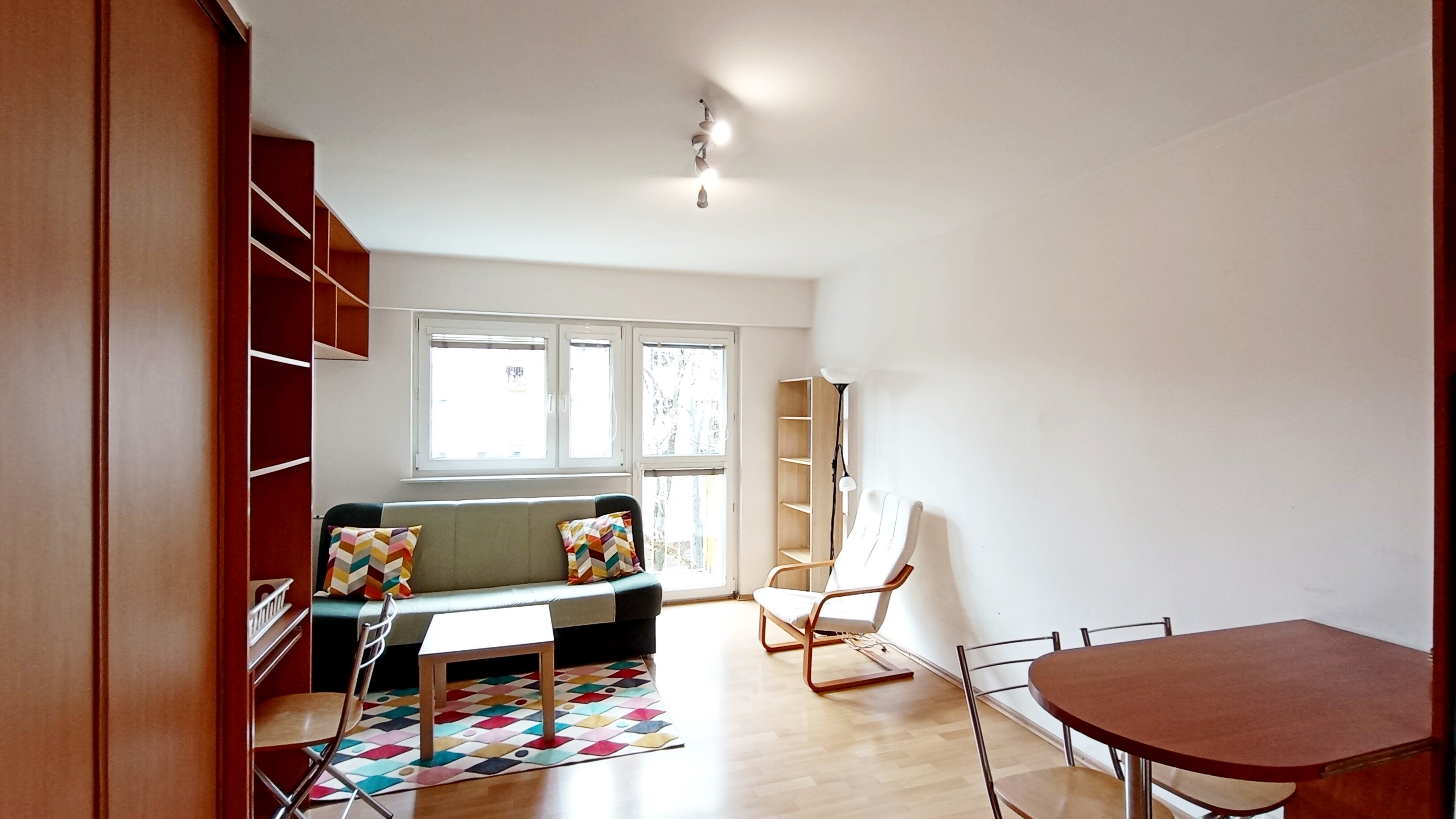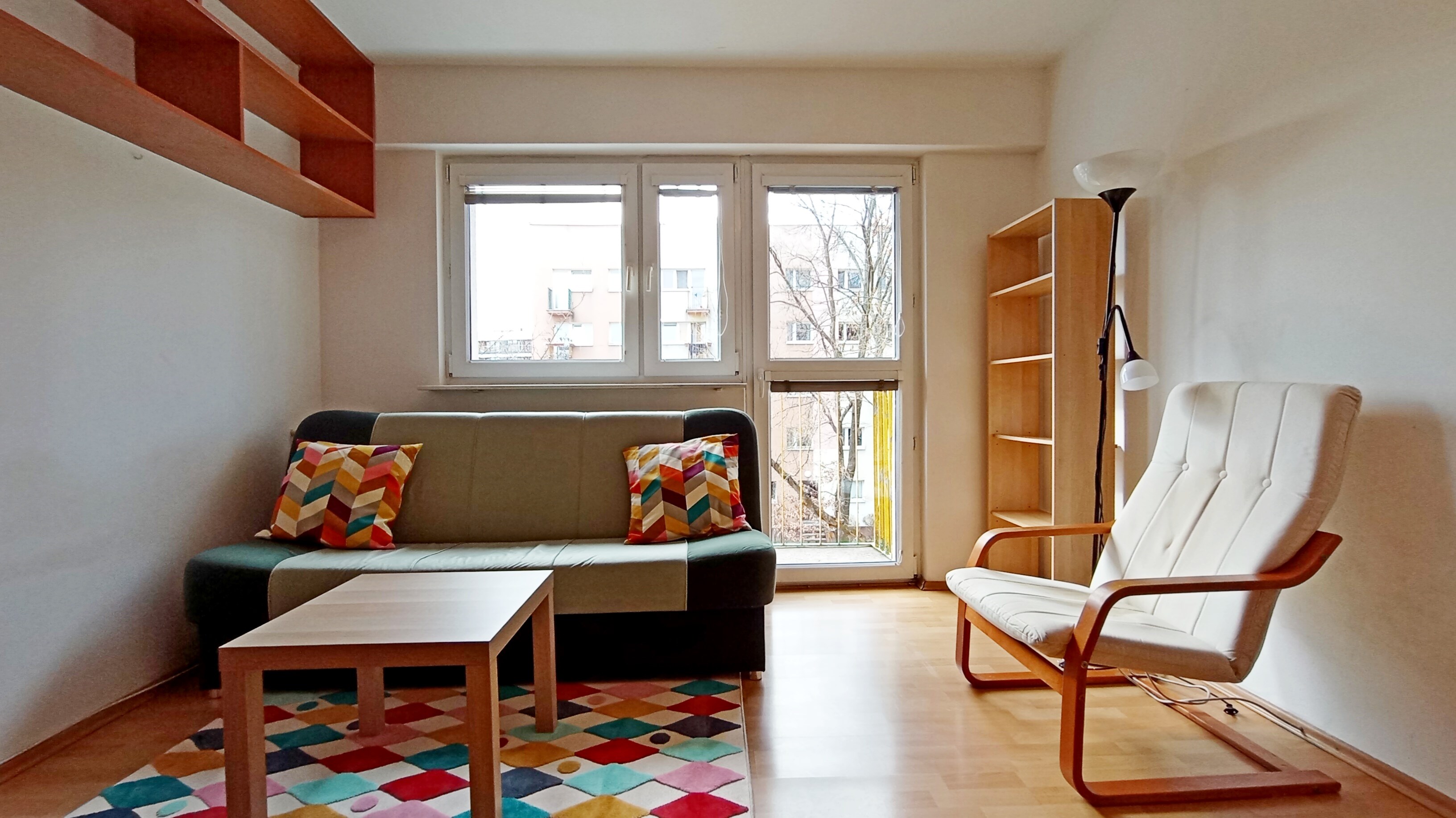 Salon: kanapa rozkładana, stolik kawowy, szafa, biurko + krzesło, stół + 3 krzesła, lampa stojąca, fotel, regał.