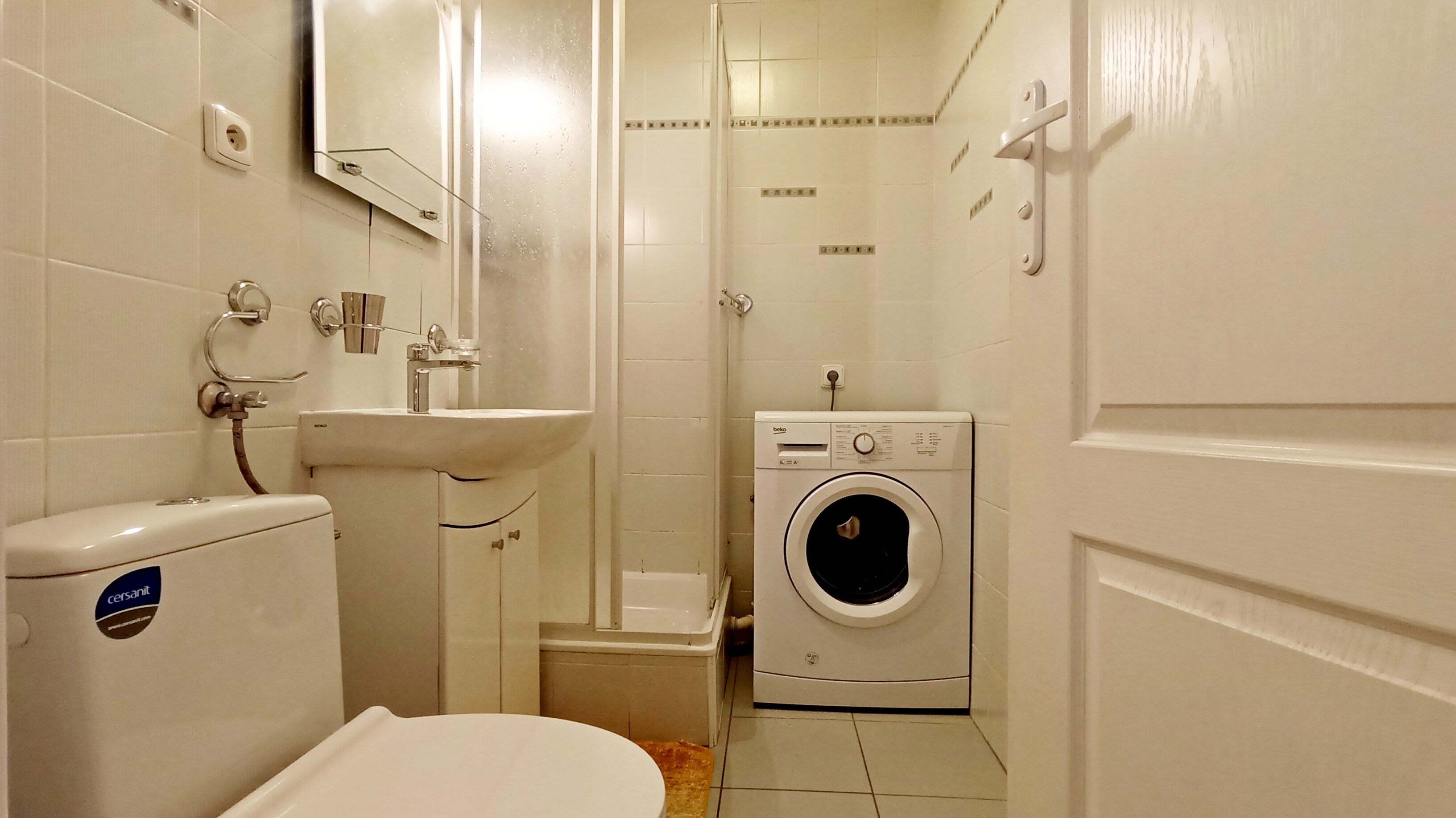 Łazienka: pralka, prysznic, WC, umywalka.