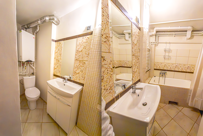 Łazienka: lustro, wanna, toaleta