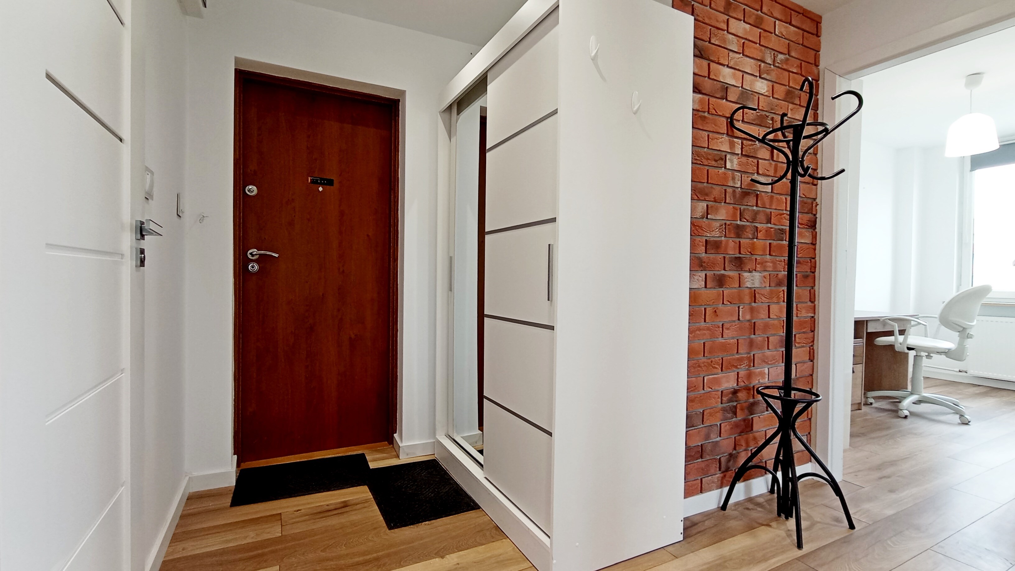Przedpokój: szafa z lustrem, wieszak, szafka na buty.