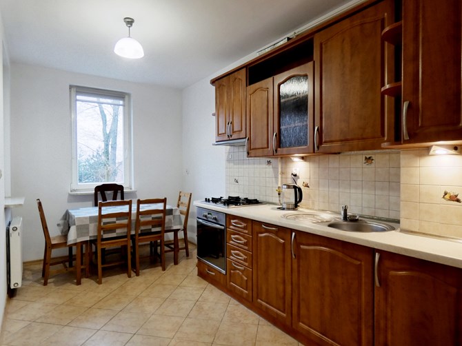 Kuchnia: lodówko-zamrażarka, okap, 4-palnikowa płyta gazowa, piekarnik, czajnik elektryczny, zlew z ociekaczem, stół + 4 krzesła.