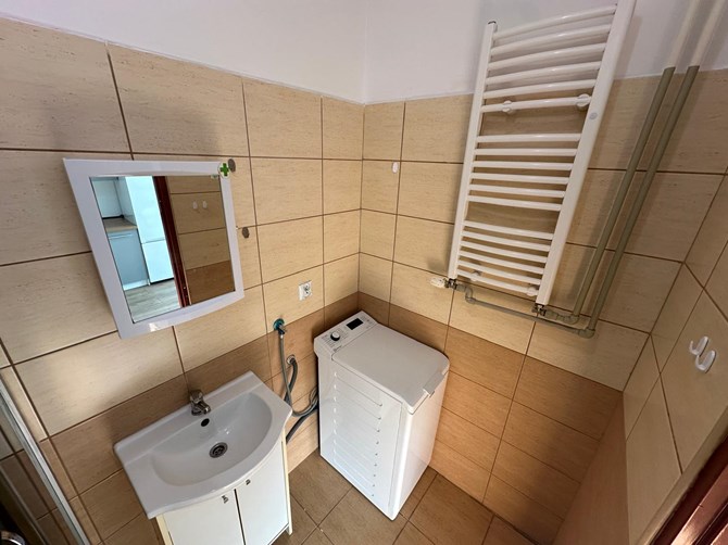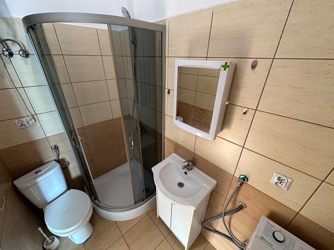 Łazienka: prysznic, pralka, toaleta, szafka z umywalką, lustro łazienkowe.