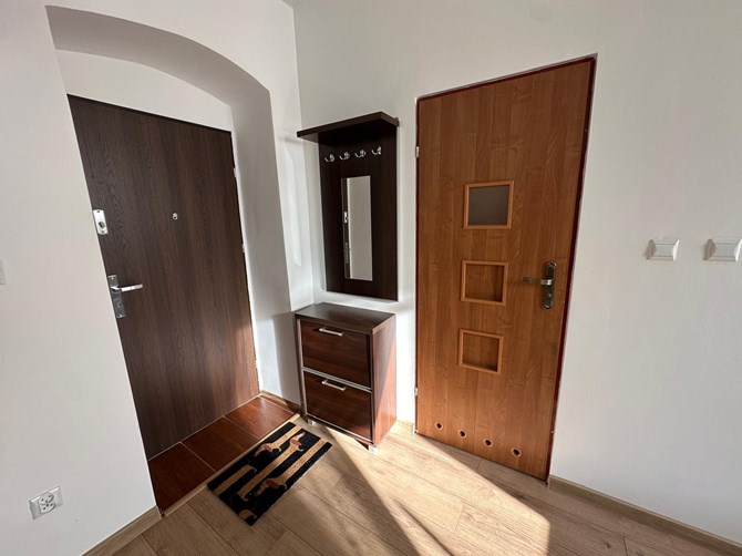 Przedpokój: wieszak z lustrem, szafka na buty, mała komoda.