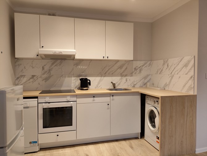 Aneks kuchenny: szafki wiszące i stojące w zabudowie, lodówko-zamrażarka, zmywarka, piekarnik, płyta ceramiczna, okap, pralka, czajnik, zlewozmywak.