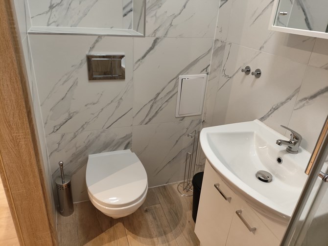 Łazienka z WC: kabina prysznicowa, umywalka, szafki.