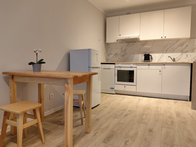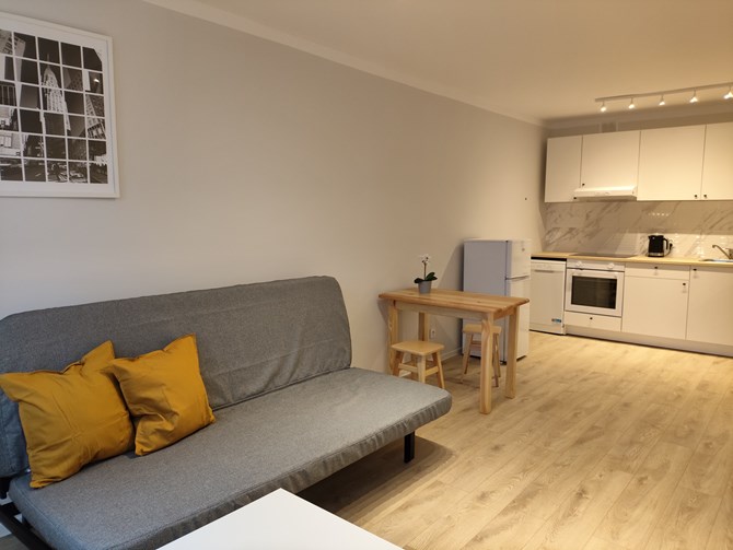 Salon z aneksem kuchennym oraz oddzielna sypialnia.