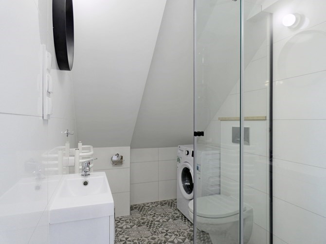Kuchnia: lodówka, 2-palnikowa płyta indukcyjna, piekarnik, okap, zlew.