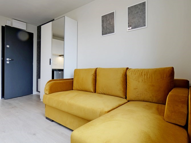 Lokal o powierzchni 25,91 m2 składa się z salonu z aneksem kuchennym, sypialni, łazienki oraz balkonu.