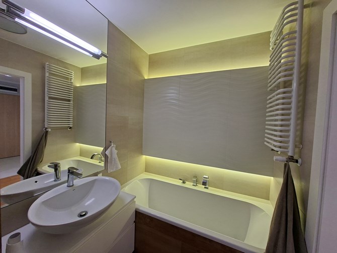 Kuchnia: lodówko-zamrażarka, okap, 4-palnikowa płyta elektryczna, zmywarka, piekarnik, zlewozmywak, czajnik - dodatkowo wyposażona w zastawę i garnki.