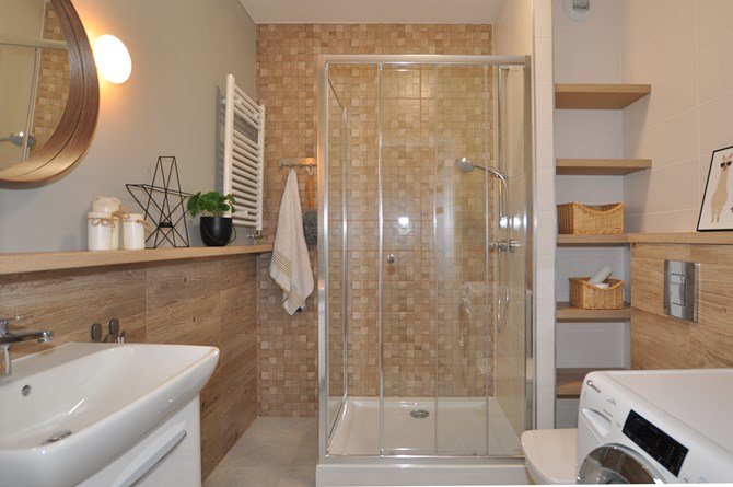 Łazienka razem z WC: lustro, kabina prysznicowa, pralko-suszarka