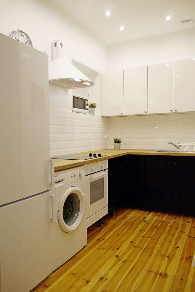 Kuchnia z jadalnią: lodówka, kuchenka, okap, zlewozmywak, szafki, pralka, piekarnik, stolik, krzesła, mikrofalówka.